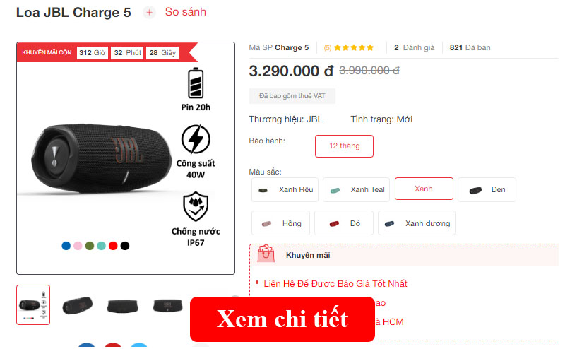 JBL Charge 5, một chiếc loa bluetooth di động chống nước, là sự phát triển và cải tiến từ mẫu JBL Charge 4 huyền thoại. Với thiết kế nhỏ gọn, JBL Charge 5 phù hợp cho mọi nhu cầu nghe nhạc của bạn ở bất cứ đâu. Model này được cải tiến với chất âm JBL Signature Pro tiên tiến mới và hàng loạt tiện ích tiên tiến ấn tượng như Bluetooth 5.1, Pin 20 giờ, USB sạc ngược thiết bị thông minh, chống nước IP67… đã và đang được rất yêu thích tại Việt Nam.
