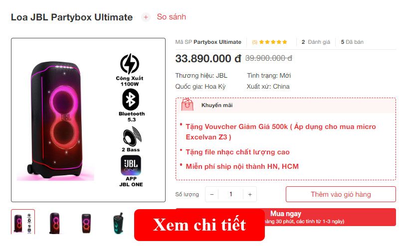 JBL PartyBox Ultimate, một mẫu loa bluetooth công suất lớn mới ra mắt của hãng JBL, được thiết kế chuyên biệt cho những buổi tiệc lớn. Với công suất 1100W siêu mạnh mẽ, âm thanh chất lượng JBL Original Pro Sound, và Dolby Atmos, loa này mang đến trải nghiệm âm thanh chất lượng và dễ dàng từ bất kỳ nguồn nhạc nào.
