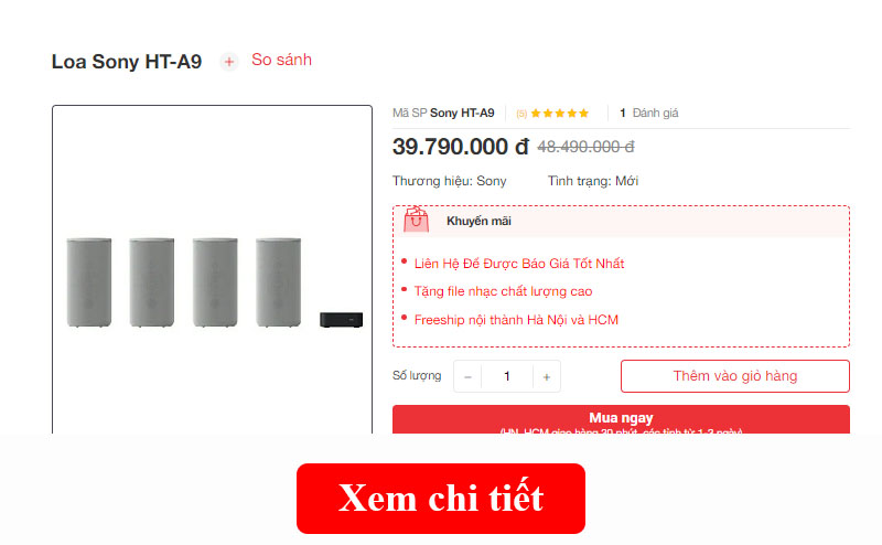 Loa Sony HT-A9 là hệ thống âm thanh rạp hát tại gia cao cấp, bao gồm bốn loa vệ tinh không dây tích hợp công nghệ 360 Reality Audio và Dolby Atmos, mang lại trải nghiệm âm thanh vòm đa chiều sống động. Với công nghệ 360 Spatial Sound Mapping, HT-A9 tạo ra trường âm thanh rộng lớn, tự động tối ưu hóa âm thanh theo không gian phòng. Kết nối đơn giản qua HDMI eARC, Optical, Bluetooth, Wi-Fi, và tương thích với trợ lý ảo như Google Assistant và Amazon Alexa. Thiết kế hiện đại và khả năng hỗ trợ 4K HDR làm cho HT-A9 trở thành lựa chọn lý tưởng để nâng cấp hệ thống giải trí gia đình